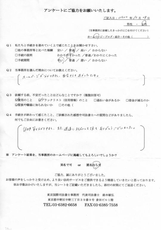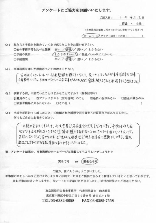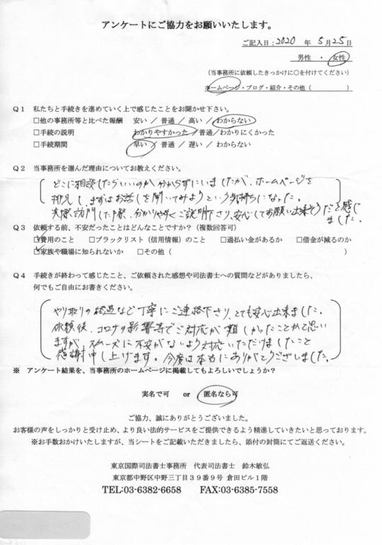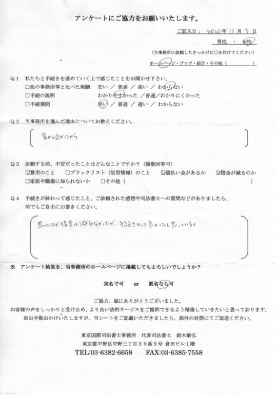 当時はインターネットで任意整理を探していまして、見つかりましたのが東京国際司法書士事務所でした。初めはいろいろと不安な事がありましたが、鈴木敏弘さんと面談をして決定しました。