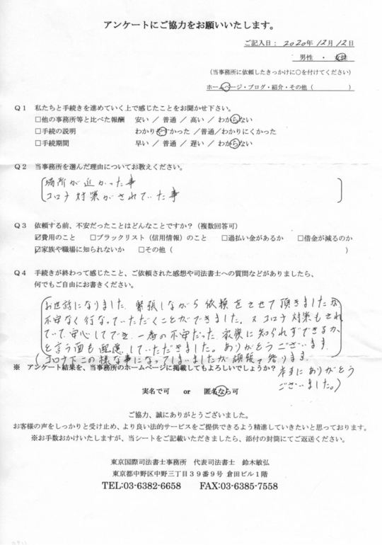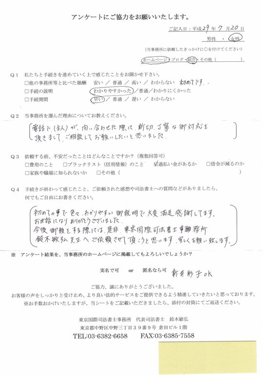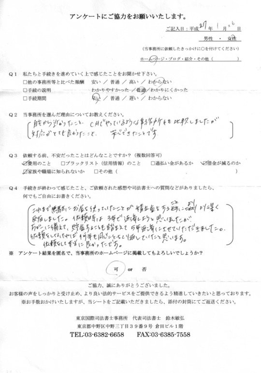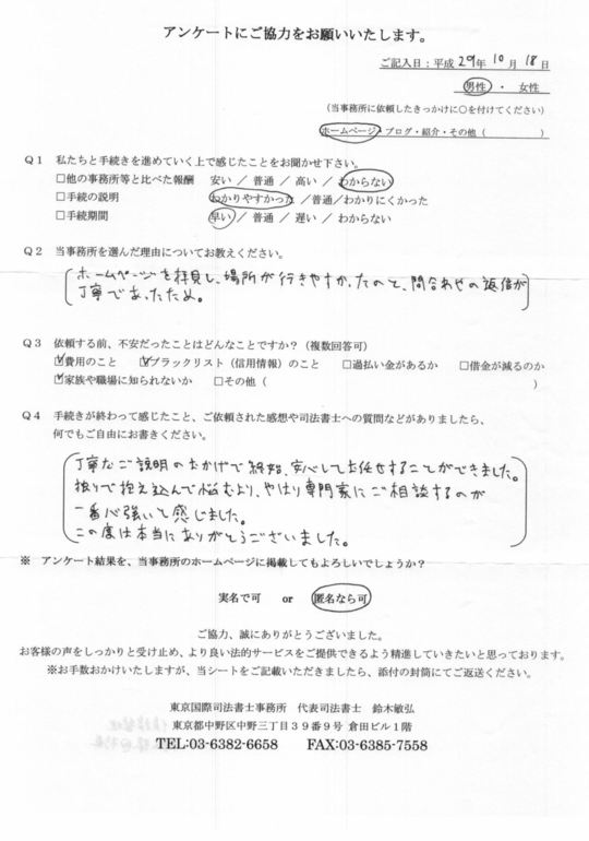 債務整理手続き完了後の事務処理・通達を早々としていただいて、本当にありがとうございました。お願いして良かったです。
