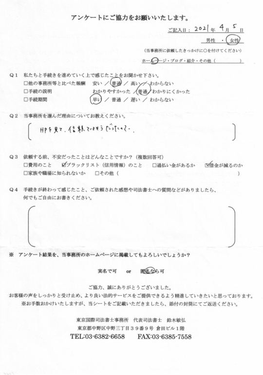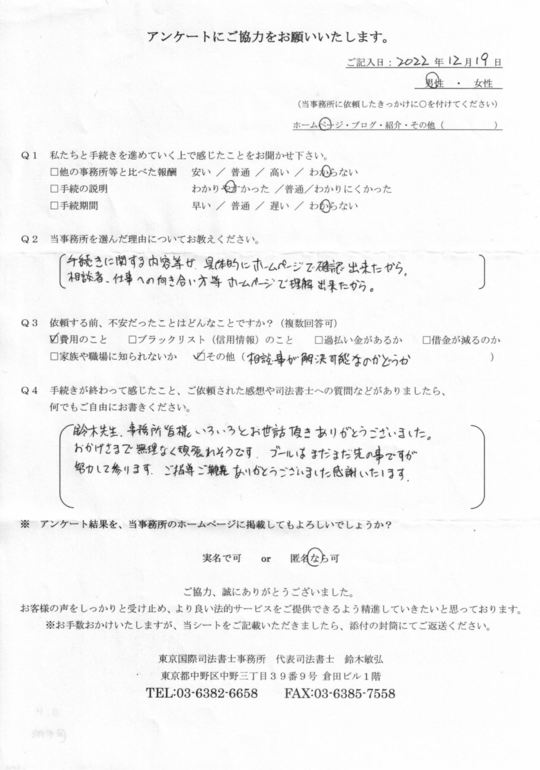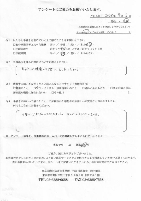 インターネットで調べた際、着手金なしでご対応頂けるのが貴事務所でしたので、今回の手続きに際し、費用面をまず考え選びました。