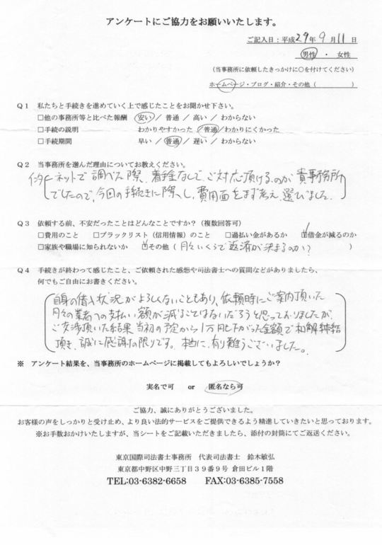 自身の借入状況がよろしくないこともあり、依頼時にご案内頂いた月々の業者への支払額が減ることはないだろうと思っておりましたが、ご交渉頂いた結果、当初の予定から1万円も下がった金額で和解締結頂き、誠に感謝の限りです。本当にありがとうございました。