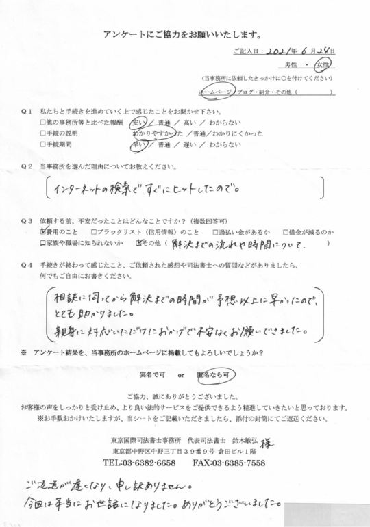 相談に伺ってから解決までの時間が予想以上に早かったので、とても助かりました。