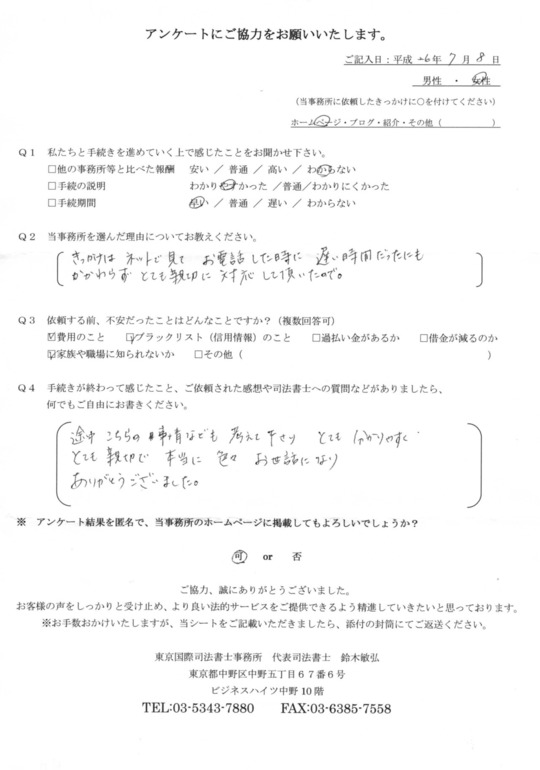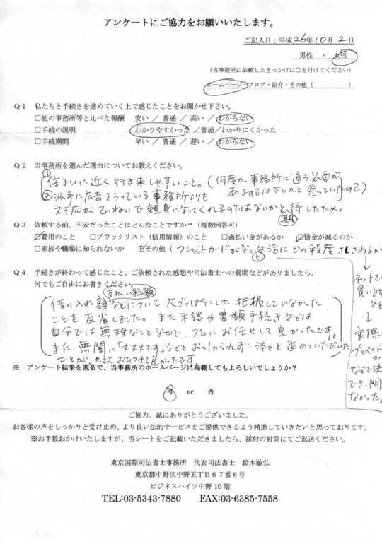 借り入れ額、支払い総額などについて大ざっぱにしか把握していなかったことを反省しました。また示談や書類手続きなどは自分では無理なことなので、プロにお任せして良かったです。また無闇に「大丈夫です」などとおっしゃられず淡々と進めていただいたことが、かえって落ち着けて良かったです。