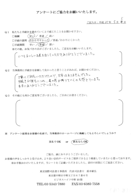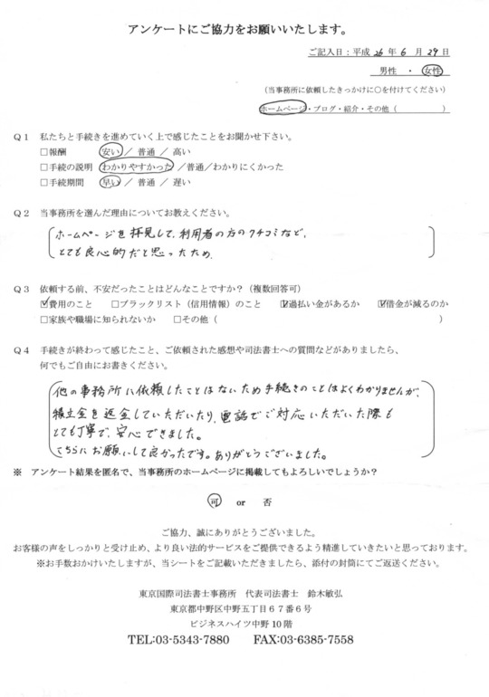 他の事務所に依頼したことはないため手続きのことはよくわかりませんが、積立金を返金していただいたり、電話でご対応いただいた際もとても丁寧で安心できました。