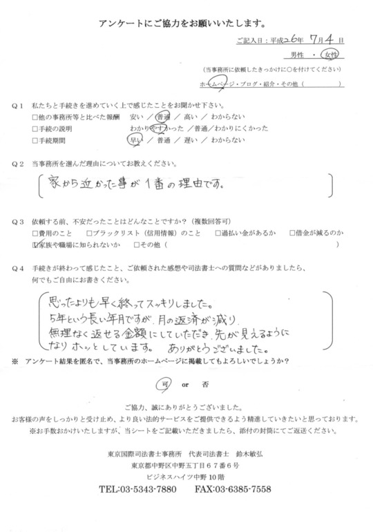 5年という長い年月ですが、月の返済が減り、無理なく返せる金額にしていただき、先が見えるようになりホッとしています。ありがとうございました。